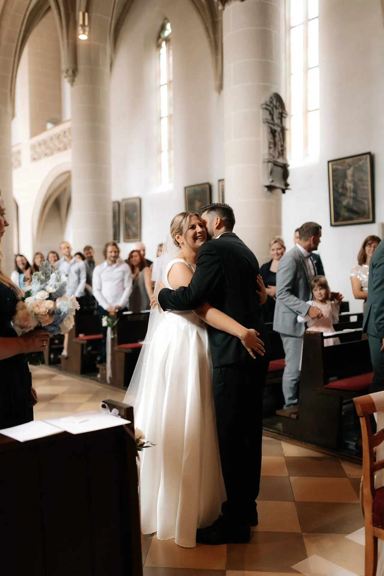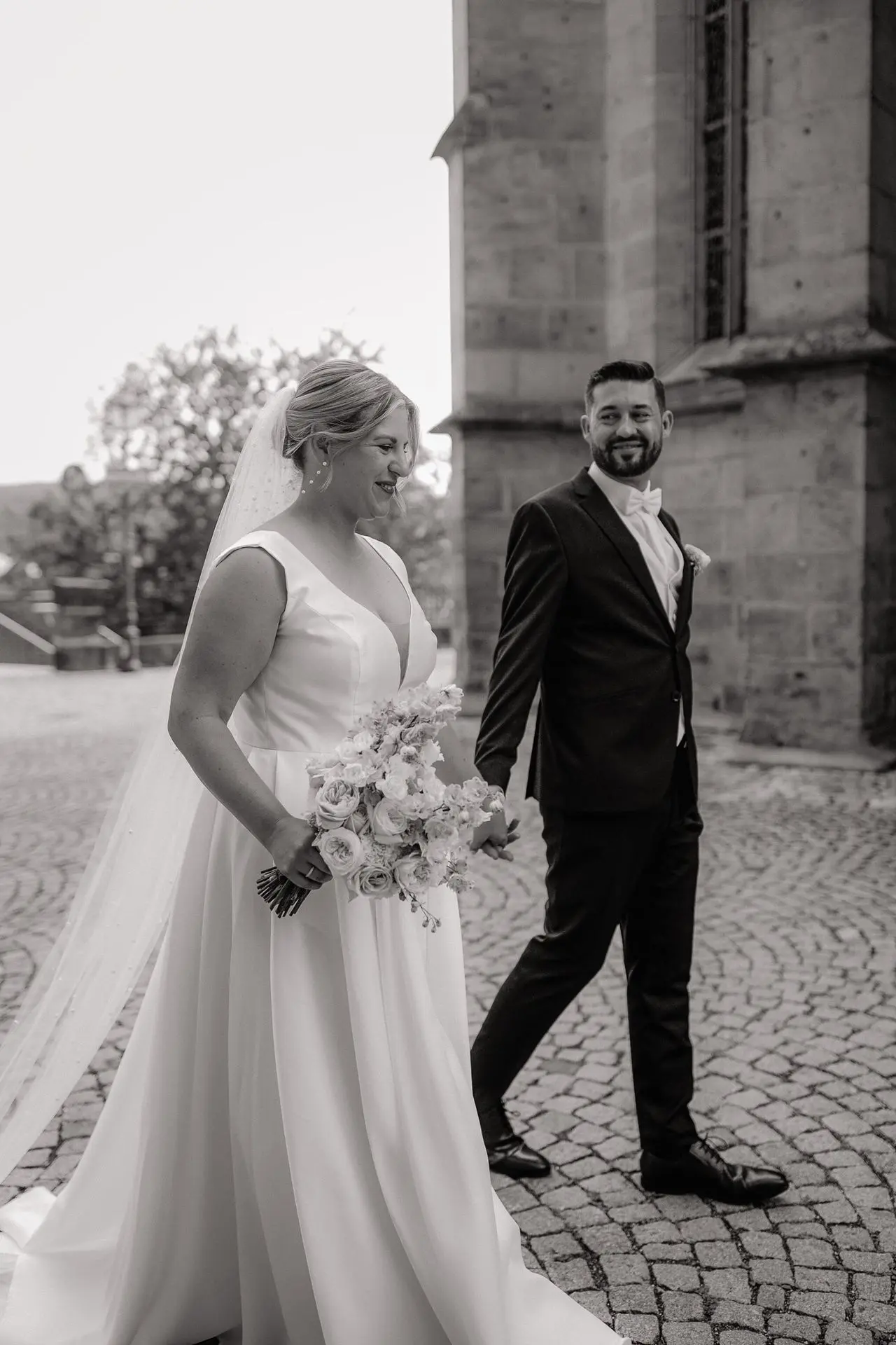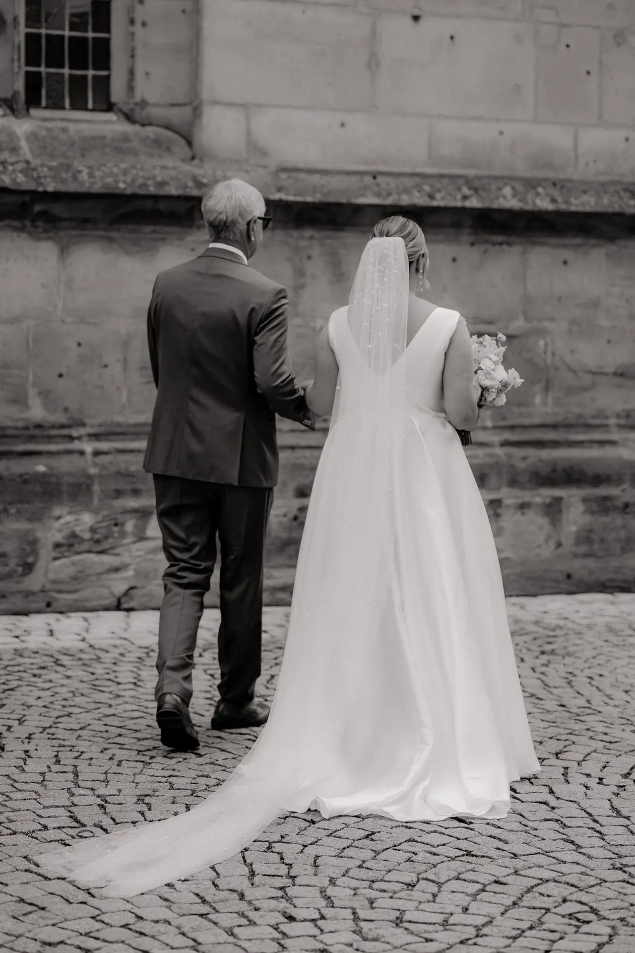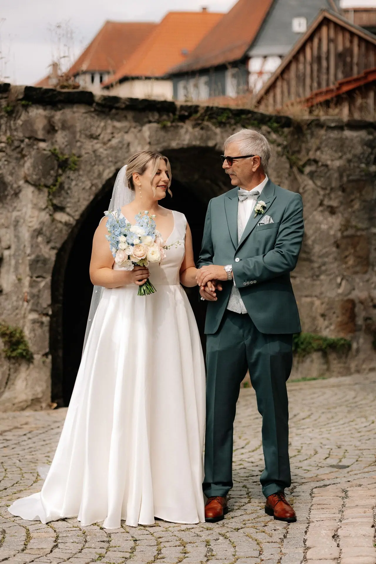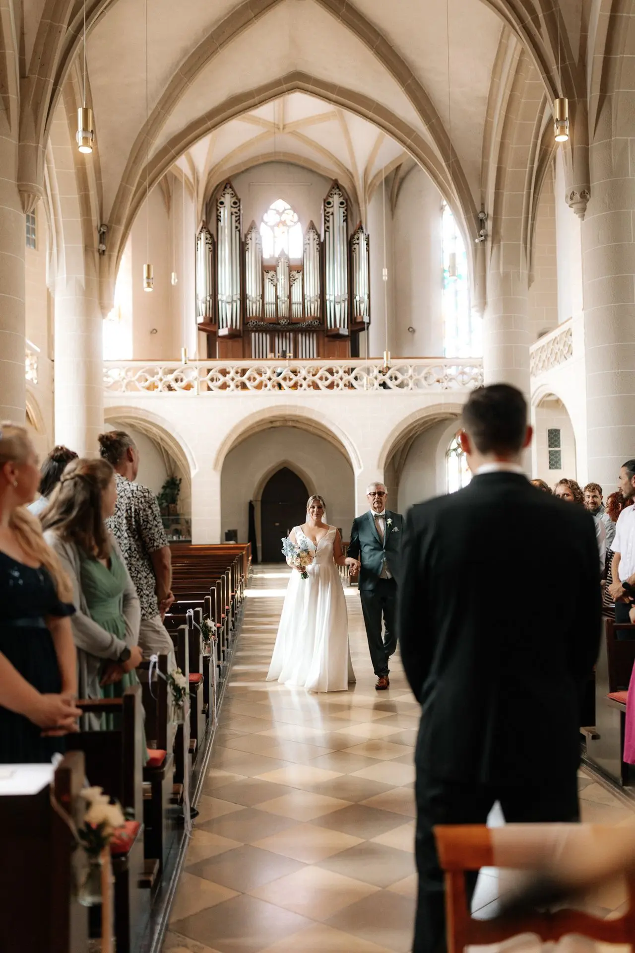 Eine der wenigen Hochzeiten, die ich während meiner Babypause in 2025 fotografiert habe, war die elegante Sommerhochzeit von Sabrina und Daniel in Kronach. An meiner Seite unterstütze mich meine zweite Fotografin Lidia, um den Tag aus unterschiedlichen Perspektiven zu fotografieren. Besonders lohnenswert war dies während der Kirche. So konnten zum Beispiel der Einzug der Braut mit ihrem Vater, sowie Ja-Wort und Ringwechsel sowohl mit Blick von vorne auf das Brautpaar, als auch von hinten aus Sicht der Gäste festgehalten werden, was der Reportage noch mehr Leben, Emotion und Authentizität verleiht.