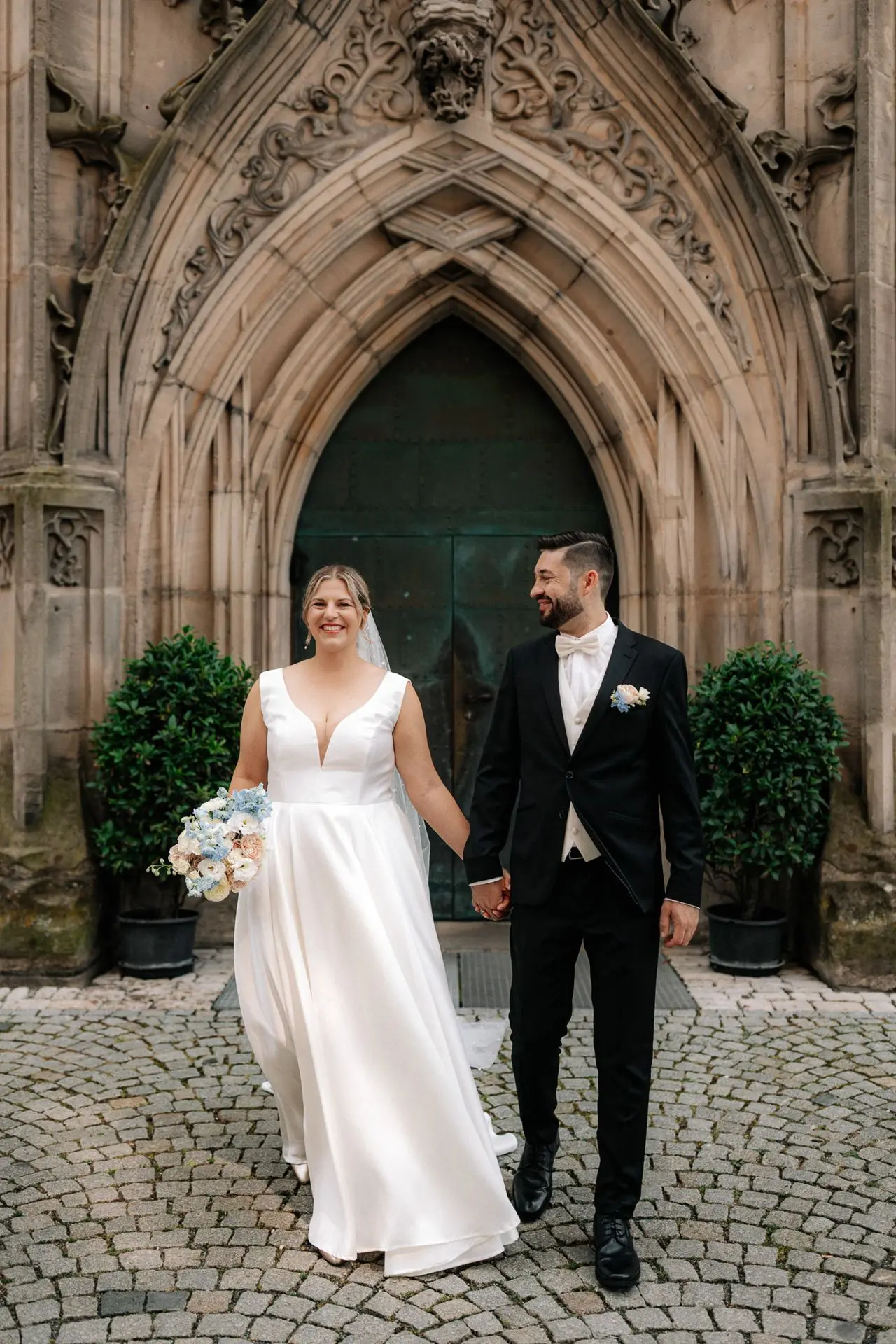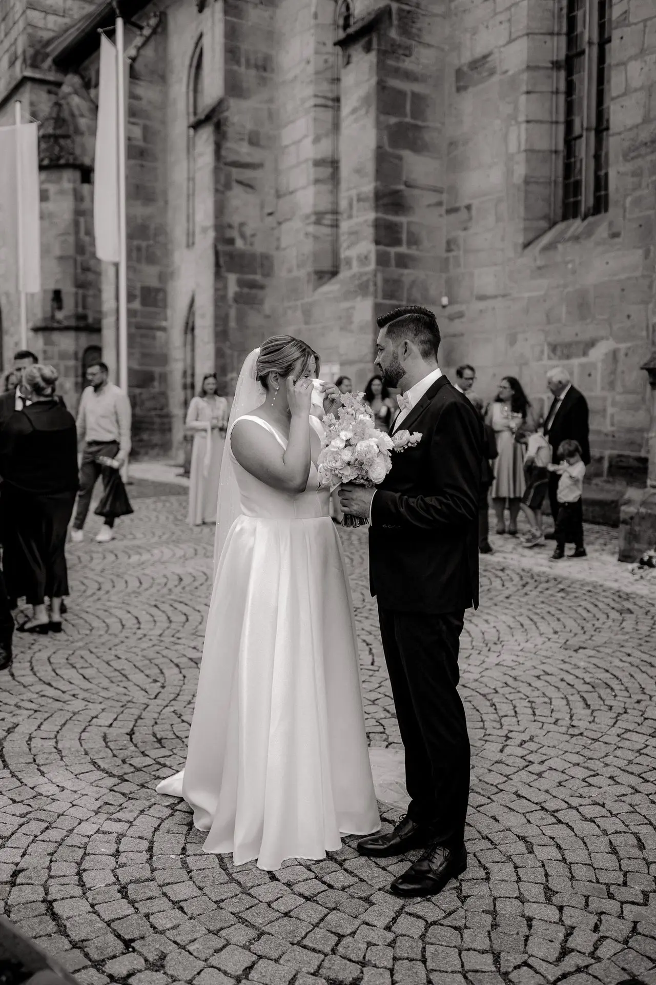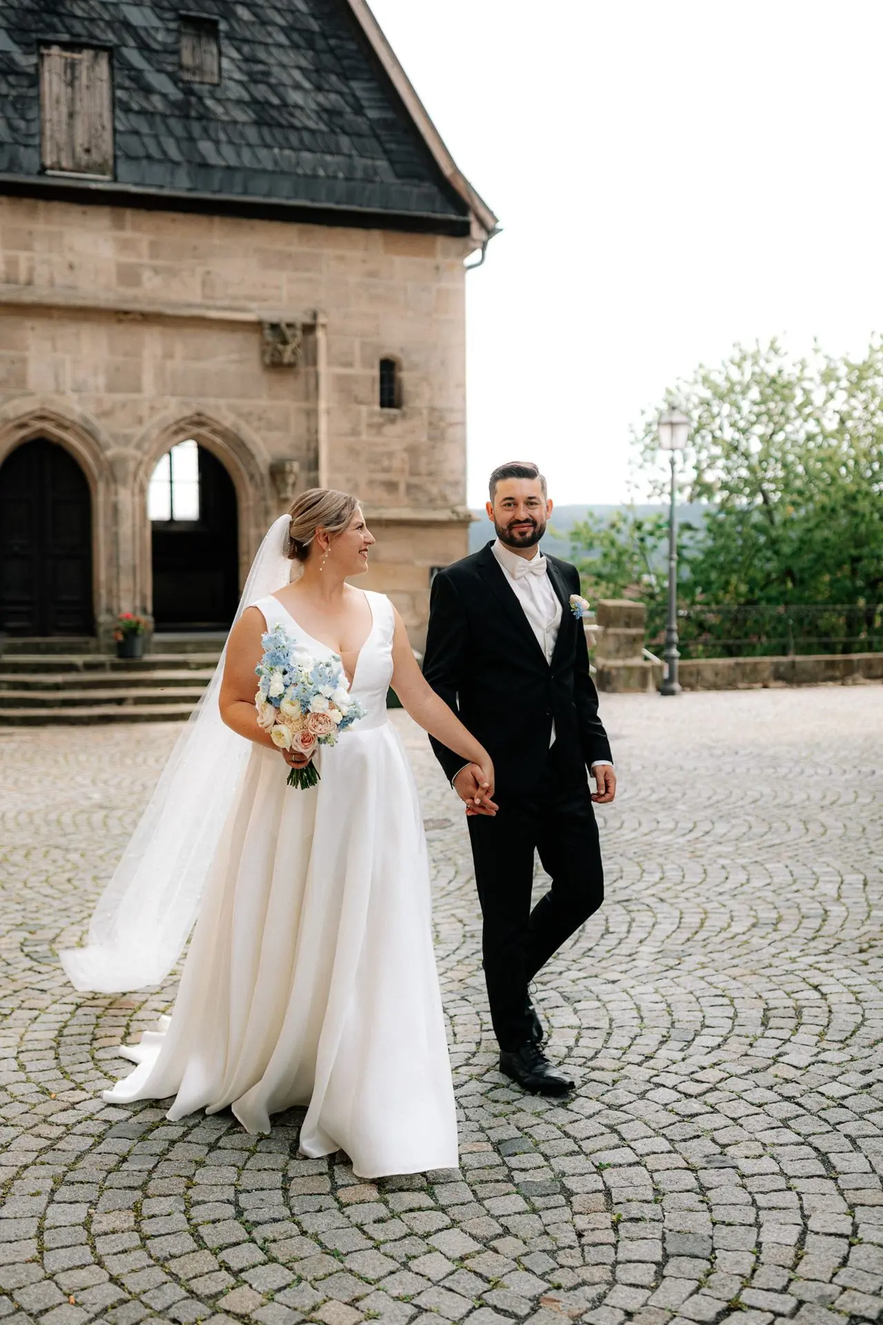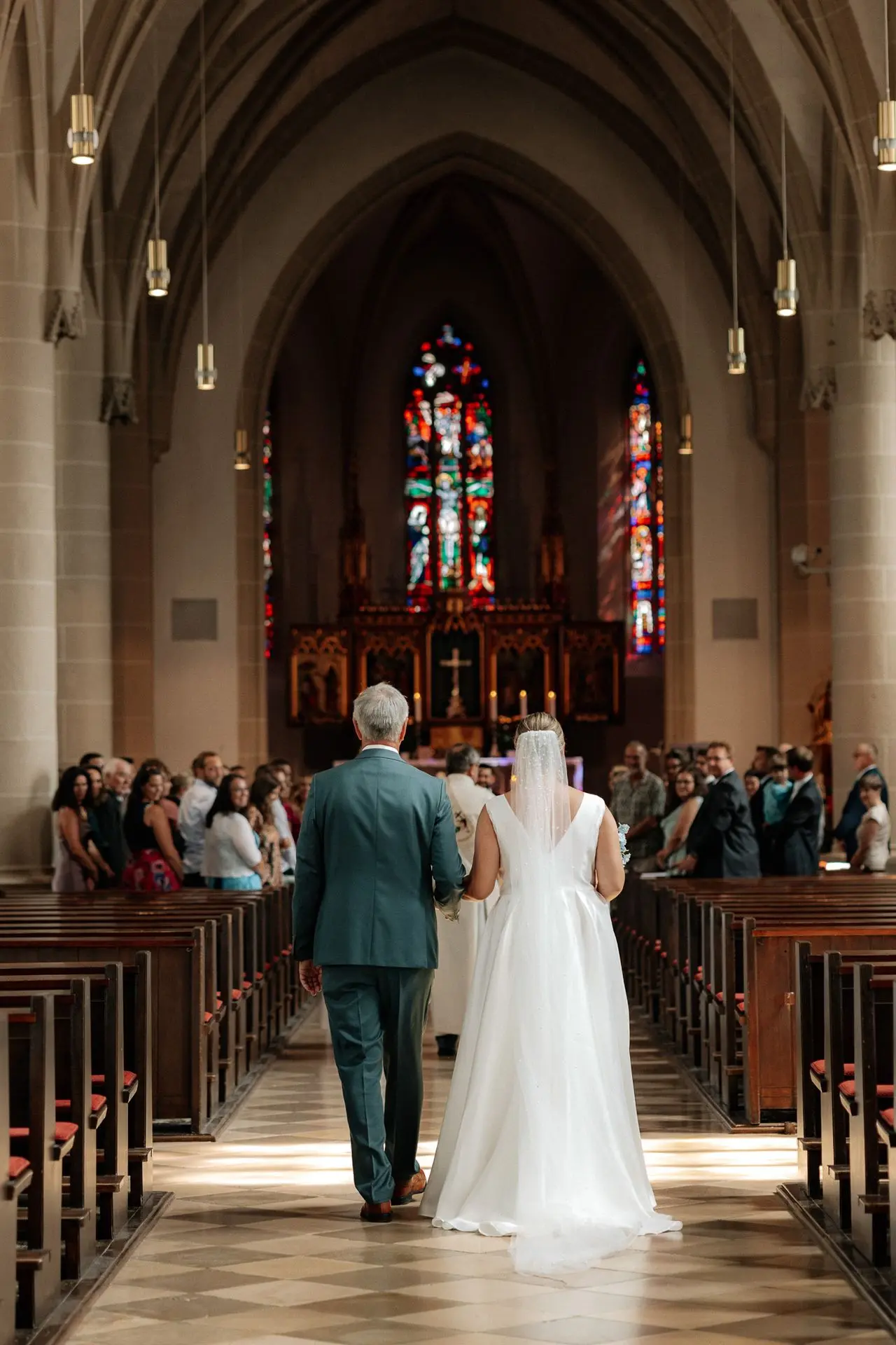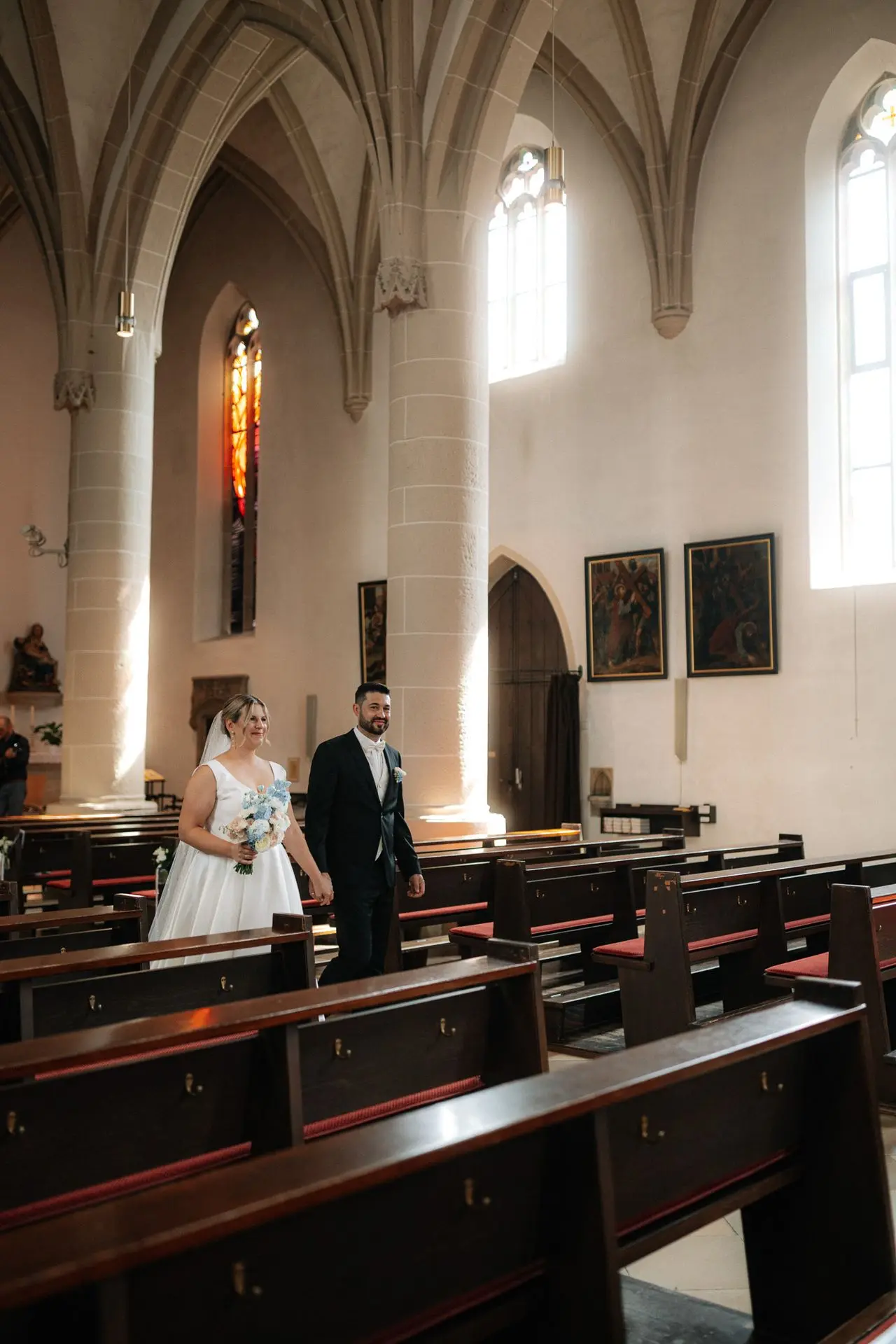Eine der wenigen Hochzeiten, die ich während meiner Babypause in 2025 fotografiert habe, war die elegante Sommerhochzeit von Sabrina und Daniel in Kronach. An meiner Seite unterstütze mich meine zweite Fotografin Lidia, um den Tag aus unterschiedlichen Perspektiven zu fotografieren. Besonders lohnenswert war dies während der Kirche. So konnten zum Beispiel der Einzug der Braut mit ihrem Vater, sowie Ja-Wort und Ringwechsel sowohl mit Blick von vorne auf das Brautpaar, als auch von hinten aus Sicht der Gäste festgehalten werden, was der Reportage noch mehr Leben, Emotion und Authentizität verleiht.