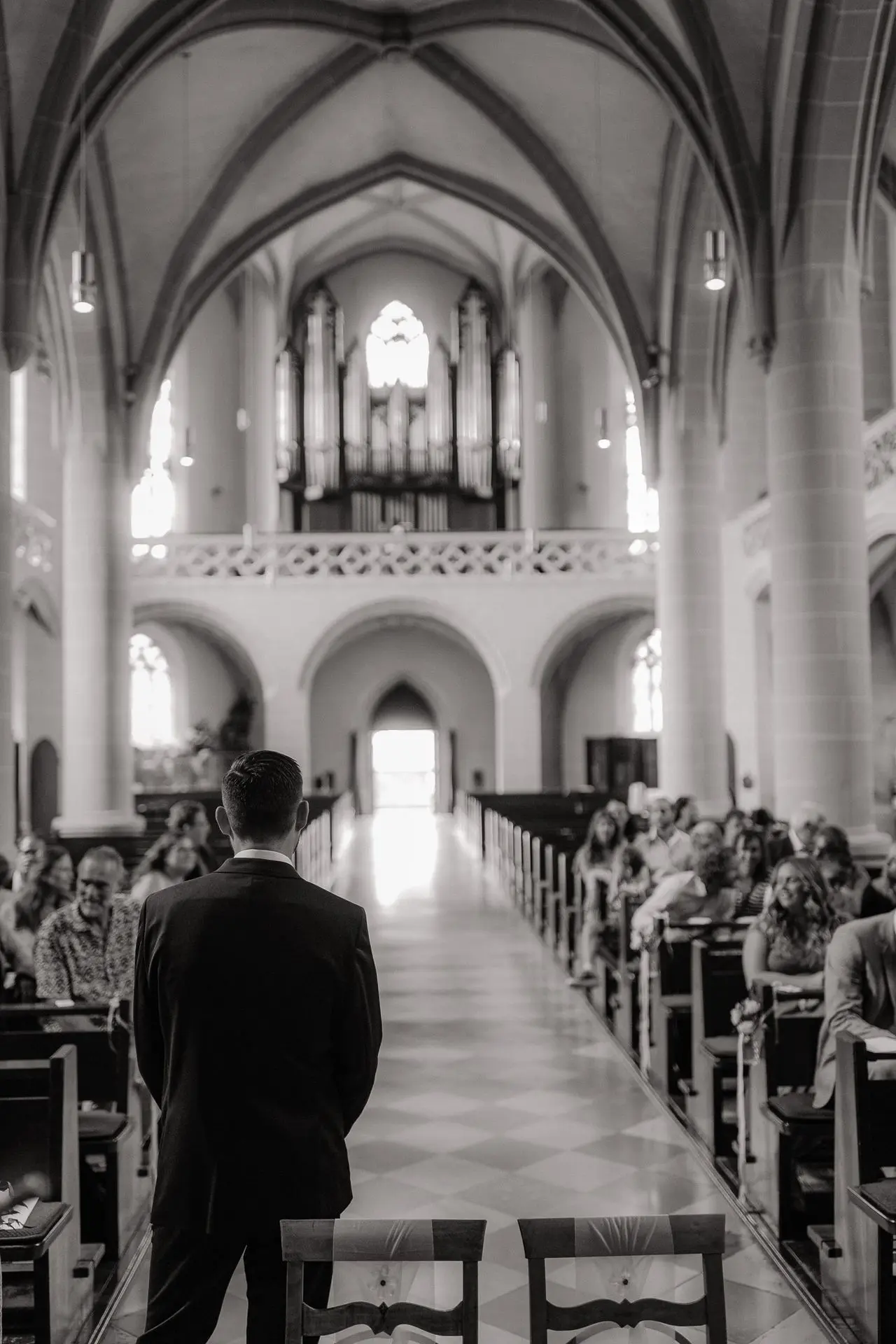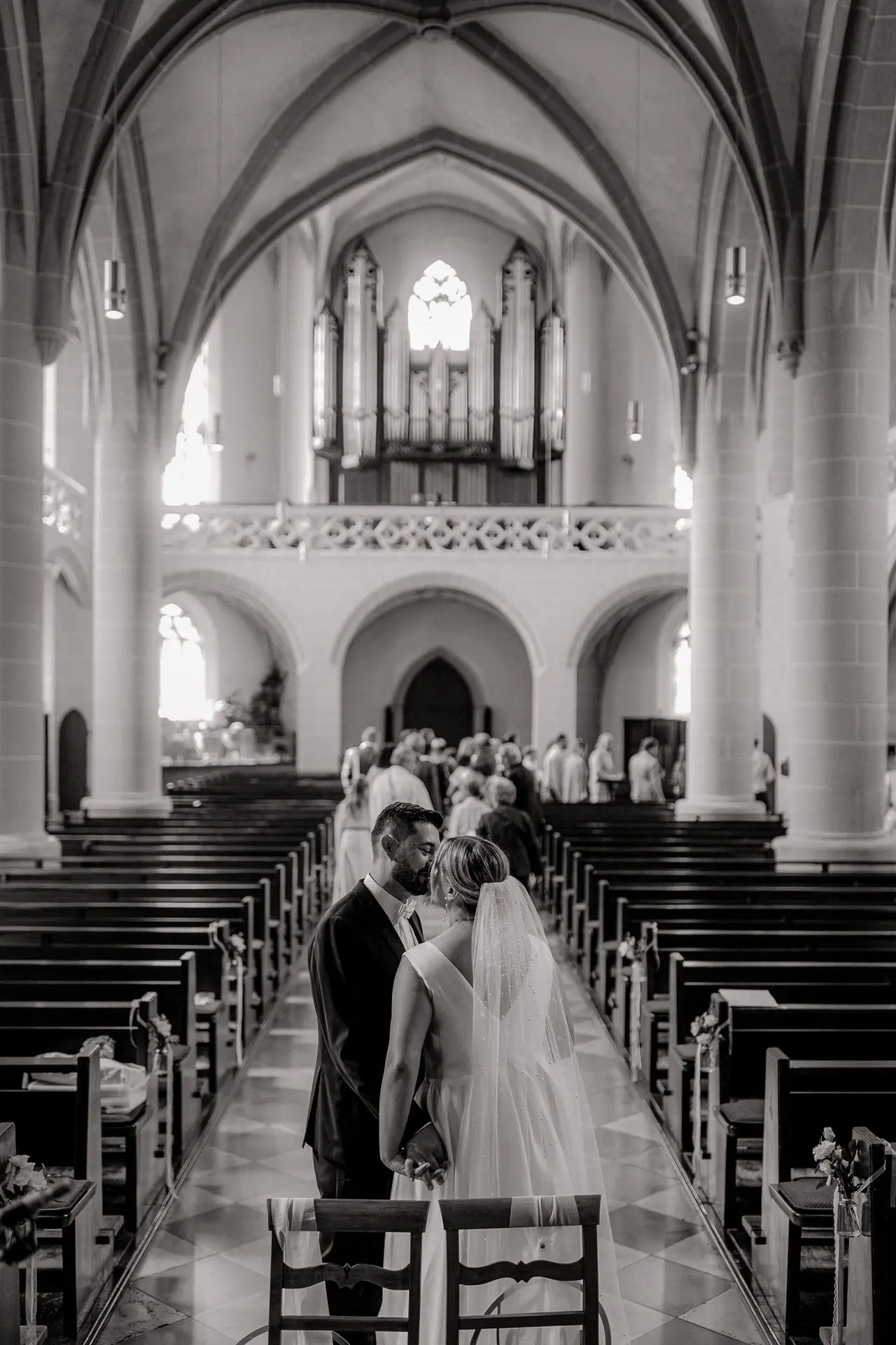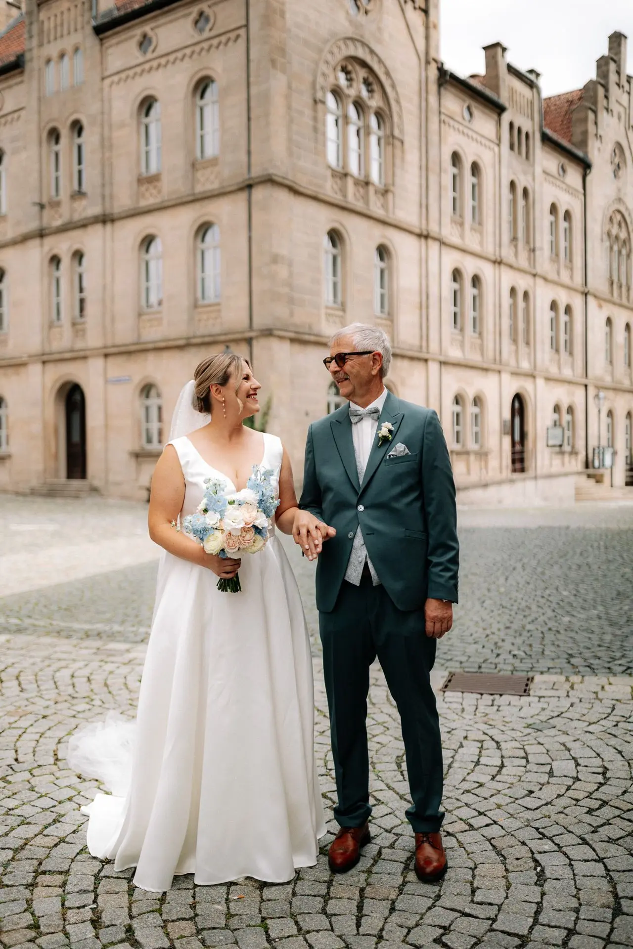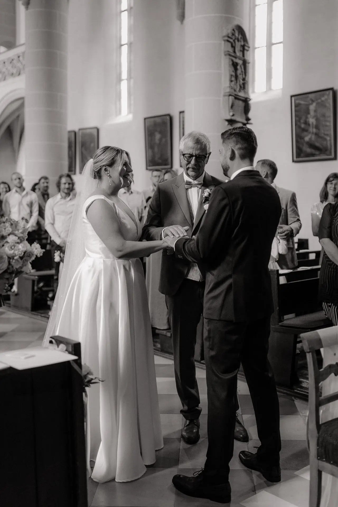 Eine der wenigen Hochzeiten, die ich während meiner Babypause in 2025 fotografiert habe, war die elegante Sommerhochzeit von Sabrina und Daniel in Kronach. An meiner Seite unterstütze mich meine zweite Fotografin Lidia, um den Tag aus unterschiedlichen Perspektiven zu fotografieren. Besonders lohnenswert war dies während der Kirche. So konnten zum Beispiel der Einzug der Braut mit ihrem Vater, sowie Ja-Wort und Ringwechsel sowohl mit Blick von vorne auf das Brautpaar, als auch von hinten aus Sicht der Gäste festgehalten werden, was der Reportage noch mehr Leben, Emotion und Authentizität verleiht.