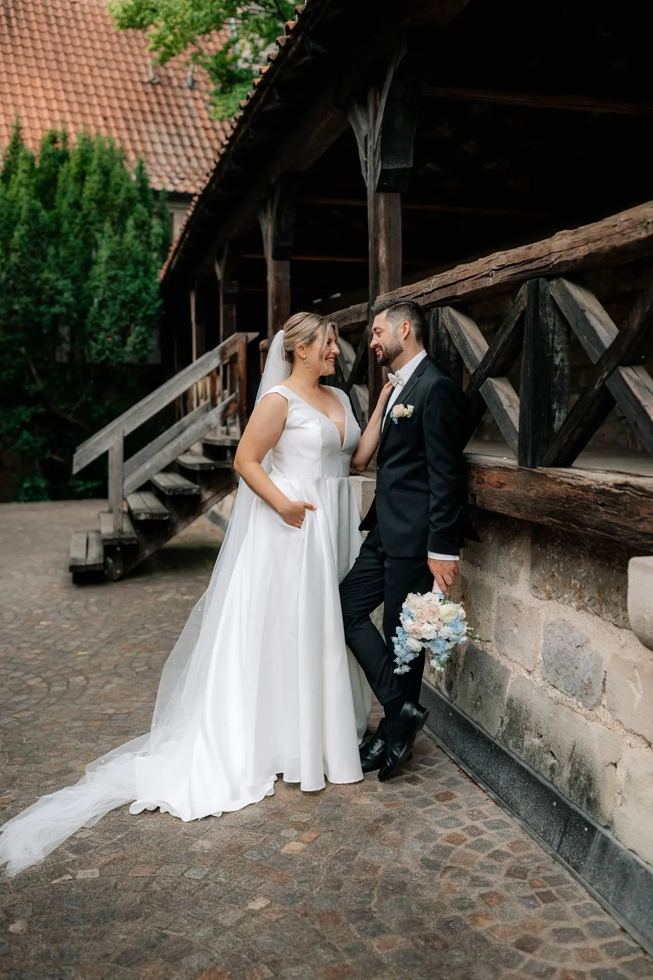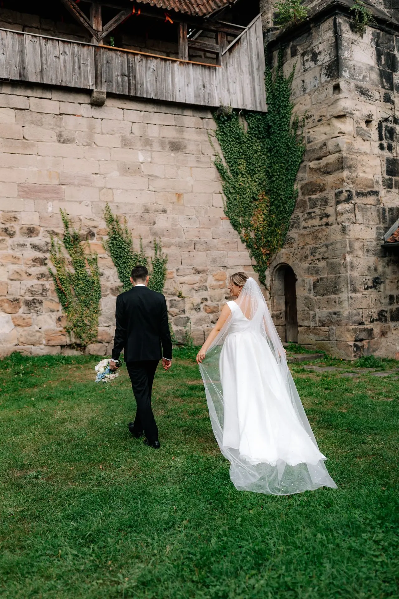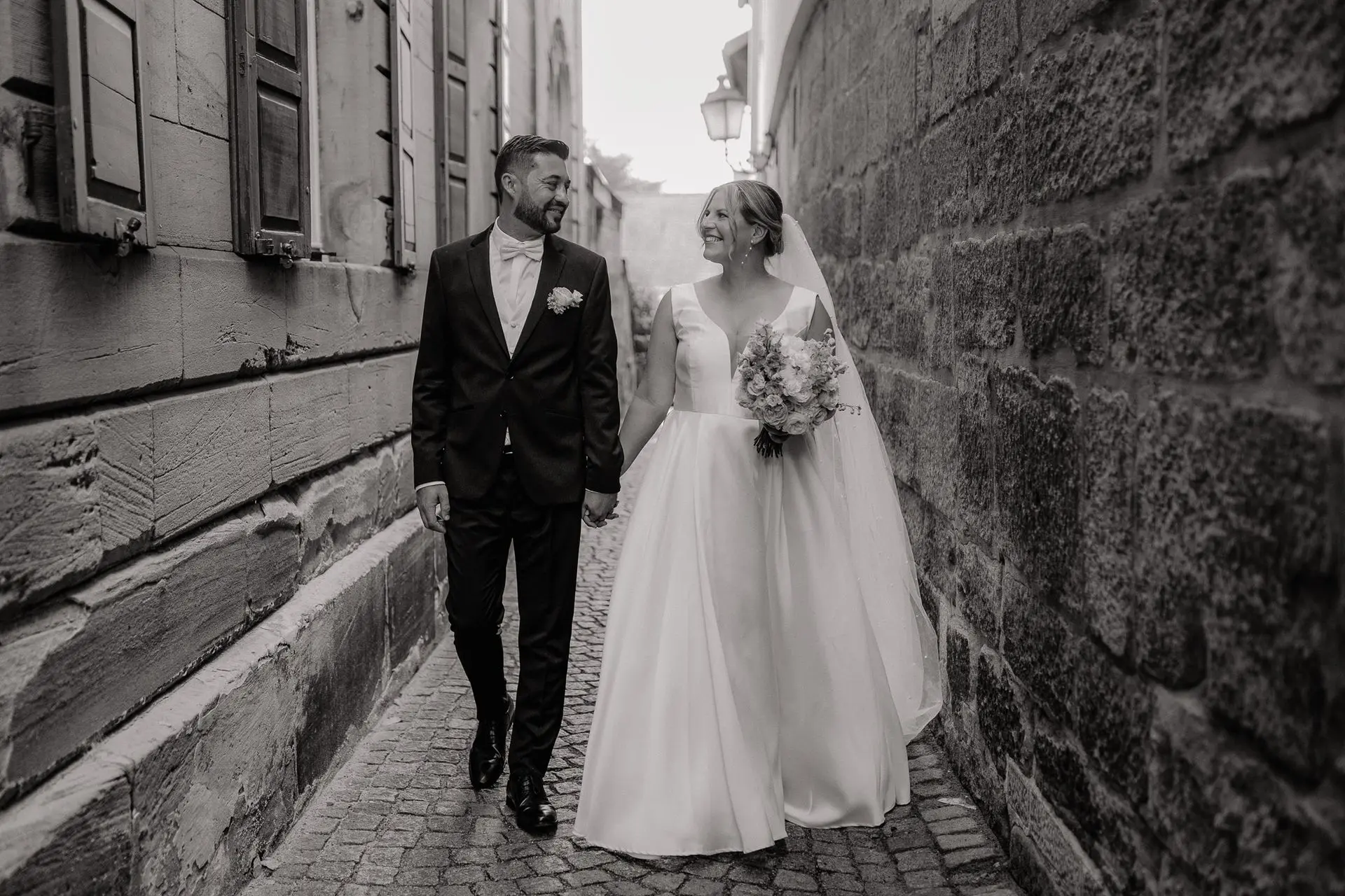 Nach der Trauung konnte ich mit dem frisch verheirateten Paar zu einem entspannten Portrait-Fotoshooting in der romantischen Altstadtkulisse der malerischen Kleinstadt Kronach aufbrechen, während meine zweite Fotografin die Gäste bereits zur Location in der Festscheune Redwitz begleiten und dort Aufnahmen von Dekoration, Räumlichkeiten und den Gästen festhalten konnte.